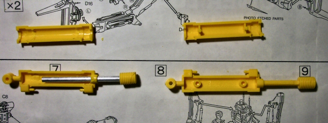 | The arms were started by adding tubing to the "triceps" pistons to add more realism. Any ejector pin marks were filled as well. The forks and pistons were positioned in place when I joined both arm halves and putty was again used for the seams. I'd been thinking of making the elbows and wrists movable joints but since I would have to really manipulate Ripley's arms, I quickly decided not to. However, I changed my mind about the wrists when I planned out the pose. Again, sewing thread was used to cut them out. After this, I built up the missing walls with styrene, super glue and putty. I drilled a straight hole through all the pieces and inserted a piece of wire hanger to allow the wrist to turn. It's also tight enough to hold the fork assembly in any pose. |